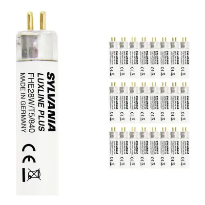 I Confezione Multipack 25x Sylvania Luxline Plus T5 28W - 840 Bianco Freddo | 115cm sono tubi fluorescenti di dimensioni inferiori rispetto ai T8 / TL-D. Si prega di controllare sempre la potenza e la lunghezza del tubo, in quanto sono correlati. Nel caso in cui si desideri effettuare una sostituzione di un tubo esausto è necessario acquistare un tubo con le stesse caratteristiche tecniche in termini di dimensioni e potenza. Per un elevato risparmio energetico si consiglia di scegliere soluzioni a LED..