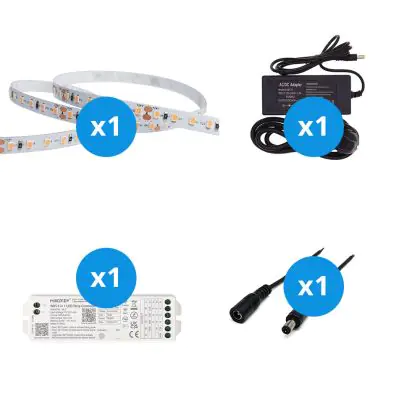 Il grande vantaggio di questo kit completo è che include tutti gli accessori necessari per installare il nastro LED a casa o in azienda. Vi forniamo il materiale necessario per installare il nastro LED. Poi si collega il tutto a una presa elettrica standard. Troverete tutte le informazioni necessarie nel nostro blog sull'installazione. Il kit comprende: