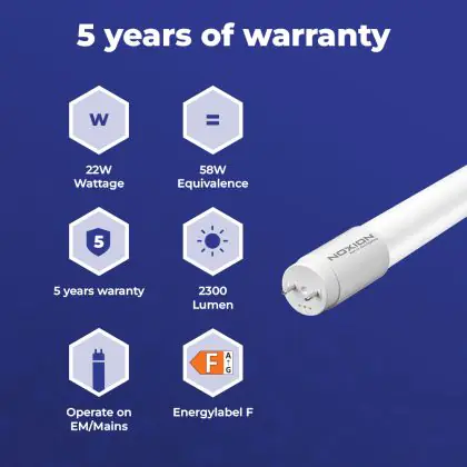 Il Noxion Tubo LED T8 Avant (EM/Mains) Standard Output 22W 2300lm - 830 Luce Calda | 150cm - Sostitutiva 58W è l’alternativa perfetta per il tubo fluorescente standard 58W nelle plafoniere con un reattore. Con questo tubo LED hai una garanzia di una vita media utile molto lunga e 5 anni Lampadadiretta.it di totale garanzia. .