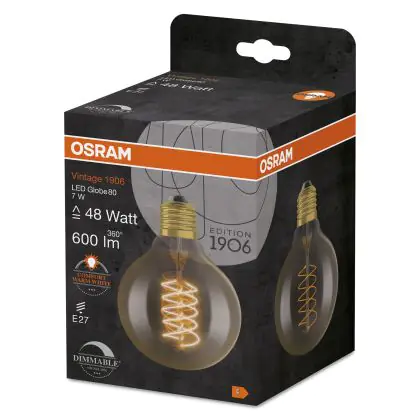 La Osram Vintage 1906 LED E27 Globe Filament Gold 80mm 7W 600lm - 822 Extra Warm White | Dimmable è la perfetta sostituzione per la tua lampada convenzionale 48W con attacco E27 grazie alla sua tecnologia LED. Passare a LED ti offrirà tanti vantaggi!