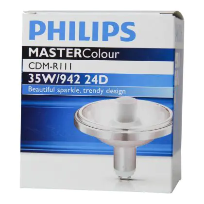 Le Philips CDM-R111 35W 942 GX8.5 24D (MASTERColour) sono lampade a scarica che combinano un design di elevata qualità ed alta efficienza. Presentano una potenza di 35W e sono dotate di attacco del tipo GX8.5. Queste lampade a scarica hanno una vita media di 9000 ore. La resa dei colori é eccezionale grazie all'indice di resa cromatica di 90-100Ra: questo sta ad indicare che le caratteristiche degli oggetti illuminati sono poste in risalto in maniera eccezionale. Queste lampade integrano la tecnologia UV-Block che consente di mantenere al meglio, nel tempo, le caratteristiche degli oggetti illuminati.