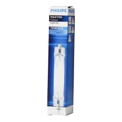 Le lampade CDM-TD sono lampade a scarica compatte a doppio attacco, caratterizzate da una brillante emissione luminosa ed un'eccellente stabilità del colore, grazie all'inserto ceramico. Le lampadine Philips CDM-TD 70W 830 RX7s (MASTERColour) presentano le seguenti caratteristiche:
