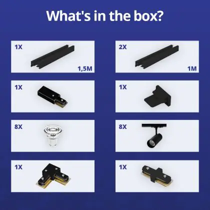 Descrizione Set completo 1-Fase Rail L 1,5 x 2 Metro Nero | incl. 8x Faretti + GU10 2700K 3W Dimmerabile + Tappo Di Chiusura, Connettore di Alimentazione e L -Connettore